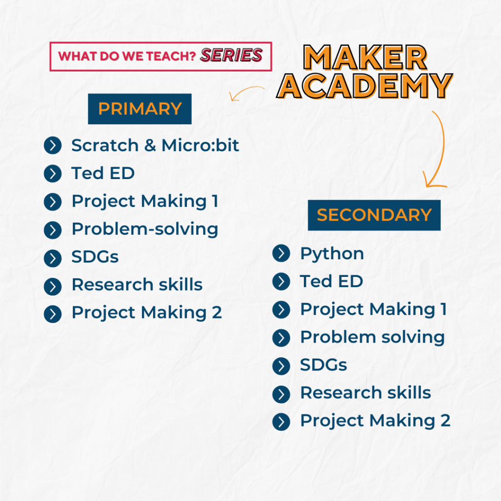 Maker Academy program is designed to empower students with the skills and mindset needed to thrive in an ever-evolving world. Through a structured, hands-on learning approach, students progress through different levels of the program, gaining valuable experience in STEM, problem-solving and critical thinking.